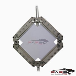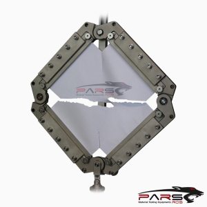 The square test specimen with corner notches is mechanically fastened to a pinned metal frame along each edge.